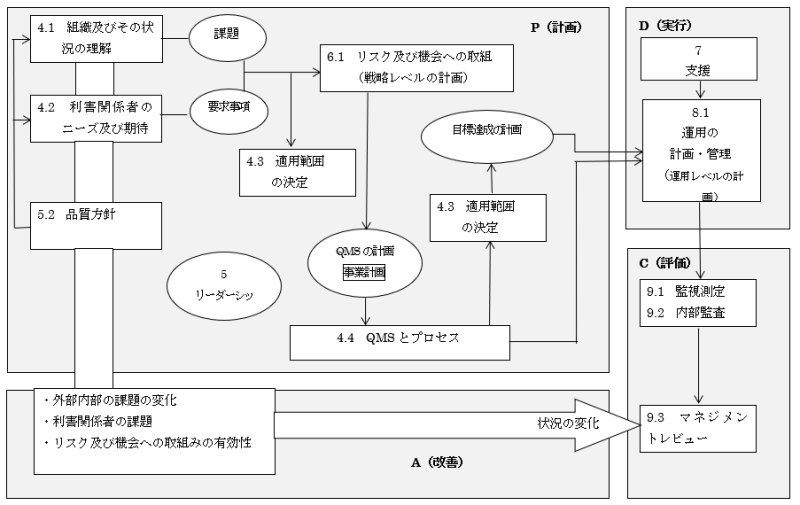 ■組織の状況(箇条4.1)、利害関係者のニーズ(箇条4.2)の変化による変更が必要になった場合には変更する。その変更によって、QMSの矛盾が生じないように完全性を保って実施されなければならない。