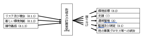 ■箇条6.1「リスク及び機会への取組み(Action to address risks and opportunities)」は、4.1で特定された「課題」と4.2で特定された要求事項」を基にしてEMSの計画を策定することである。6.1では、決定された「リスク及び機会」に対する計画策定のプロセスを明確にする必要がある。